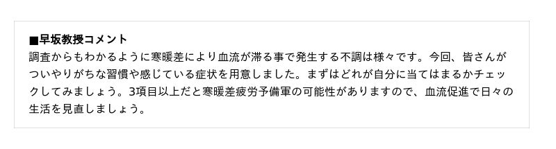 チェックシートには、早坂教授が“血流の滞り”の原因と考えている「シャワーで済ますことが多い」や「デスクワークが多い」といった習慣や行動、“血流の滞り”のサインと指摘する「目が疲れやすい」や「肩こりがある」といった、日々の不調での兆候などの項目が入っています。調査では、これらの項目に3項目以上当てはまる「寒暖差疲労予備軍」の人が約4割を占める結果となりました。また、2項目以上当てはまる人は約6割と多くの人が注意が必要な状況も明らかになりました。