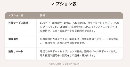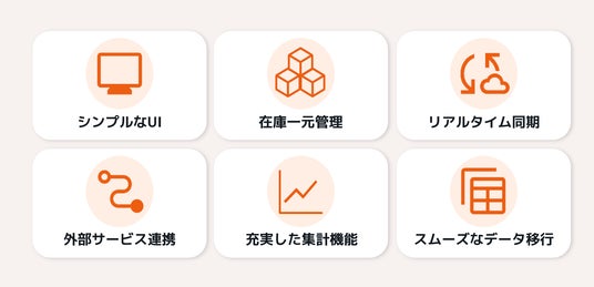 - 外部サービス連携POSレジ(スマレジ、Square)やECサイト(Shopify、BASE、futureshop、カラーミーショップ)など外部サービスと連携し、販売データや商品情報を自動同期します。