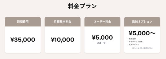 基本機能はそのままに、初期費用35,000円/月額基本料金10,000円+ユーザー料金5,000円~(いずれも税抜)という価格設定で、導入に必要なコスト負担を大幅に軽減しました。