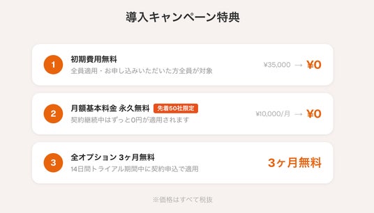 新プラン提供開始を記念し、導入キャンペーンを実施いたします。導入時のコスト負担を気にせず、まずは気軽に始められる特典をご用意しました。