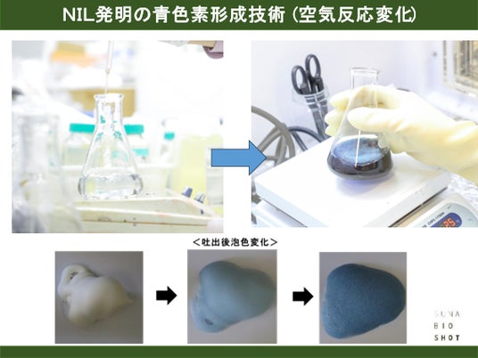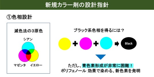 当社は、この根本課題を解決すべく、空気の力で褪色しにくい「青色」を発色させる、全く新しい色素前駆体の開発に着手いたしました。