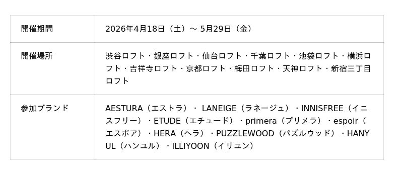 本イベントでは、同社が展開する人気コスメブランドに加え、日本未上陸ブランドや期間限定ブランドがロフトに登場。世界的に注目を集めるK-beautyの魅力を、旬の雑貨でトレンドを発信するロフトを通じてご紹介。韓国の美容文化と最先端スキンケアサイエンスが融合したK-beautyの世界観を、ブランドごとの魅力とともに体験できる特別な機会です。