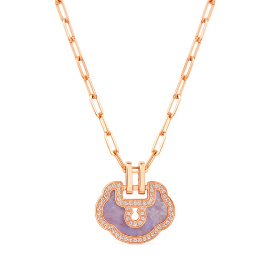 【上】Qeelin Yu Yi コレクション ミディアムネックレス ¥733,700 (18K ローズゴールド、ダイヤモンド、ラベンダー翡翠) 【下】Qeelin Yu Yi コレクション ミディアムブレスレット ¥678,700 (18K ローズゴールド、ダイヤモンド、ラベンダー翡翠)