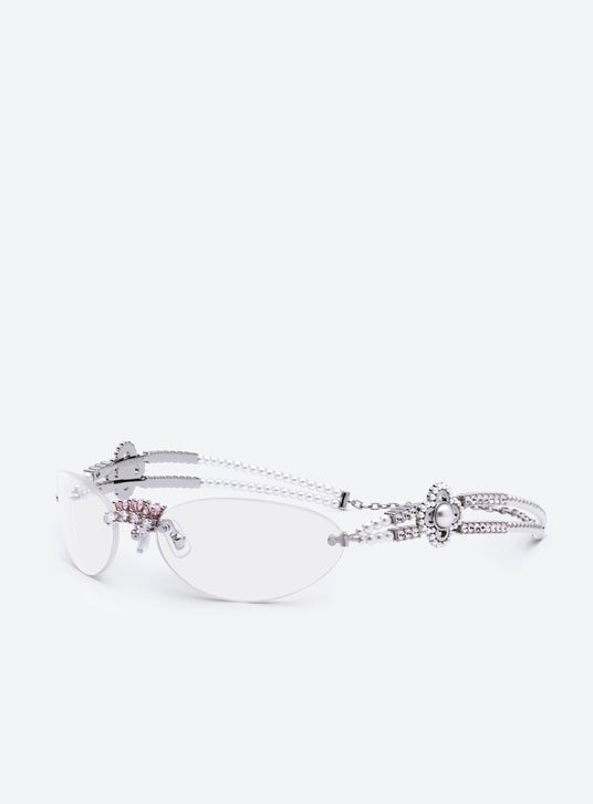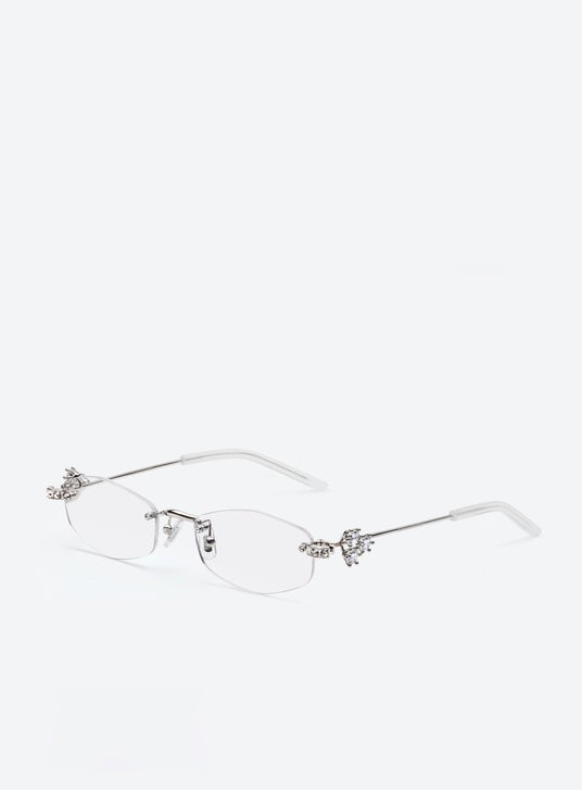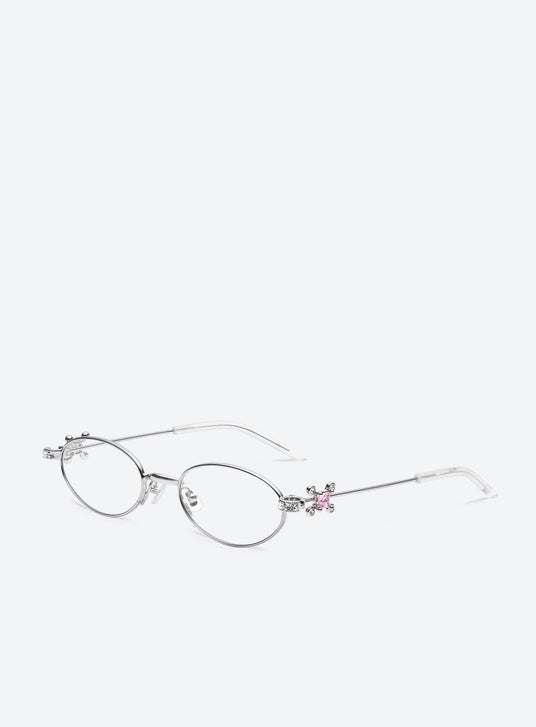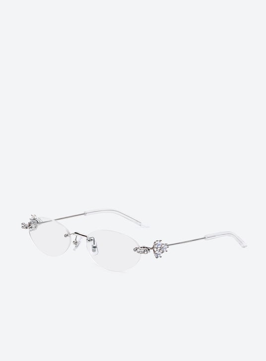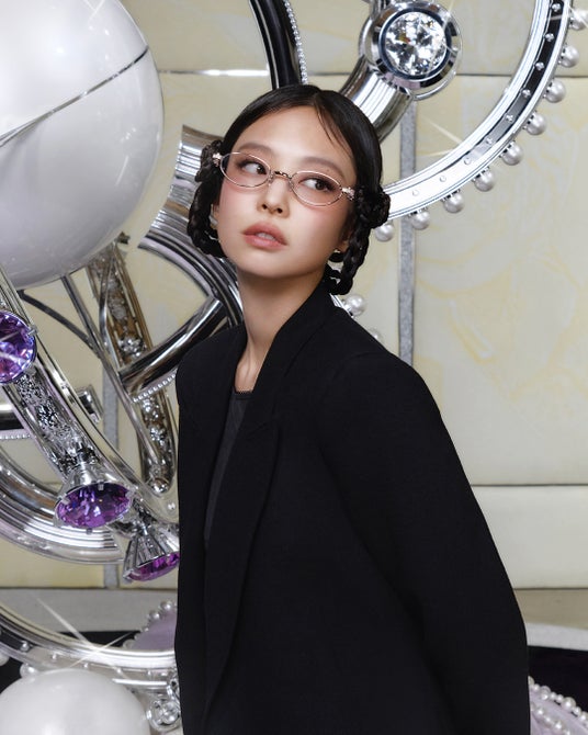 ジェニーが着用したGLITZ-02とON RING-02は、ジュエリーの華やかさが感じられるシルバーメタル素材のオーバルフレームサングラスで、テンプル部分に繊細なジェムストーンの装飾があしらわれているのが特徴です。