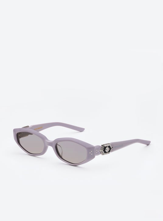 Kōki,が着用したGALA-02は、パールとジェムストーンで装飾されたテンプルが特徴で、ネックレスとしてもスタイリングできるアイテムです。VEGAX-V4はバイオレットアセテート素材のオーバルフレームサングラスで、テンプルに施されたジュエリー装飾が魅力です。ORORA-02はシルバーメタルフレームのオーバルシェイプサングラスで、テンプルに構築的なジェムストーンの装飾があしらわれています。