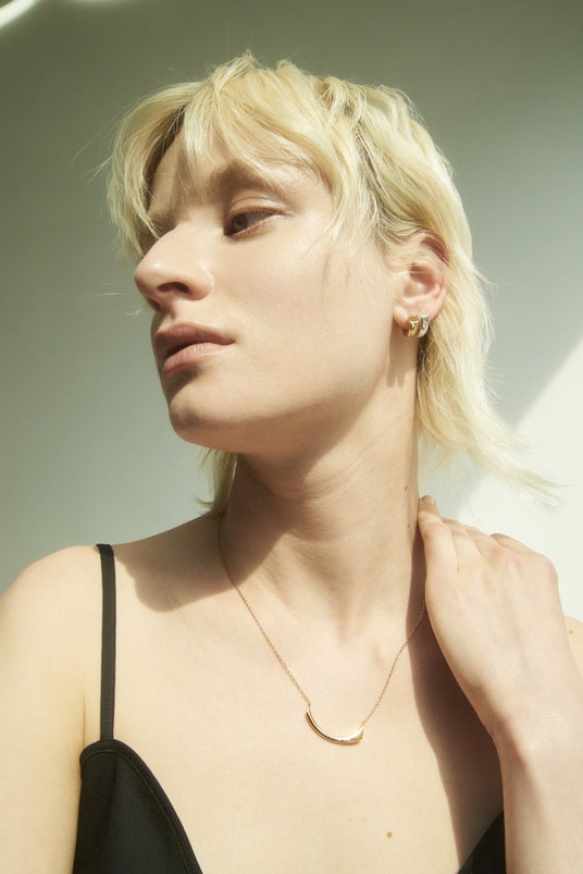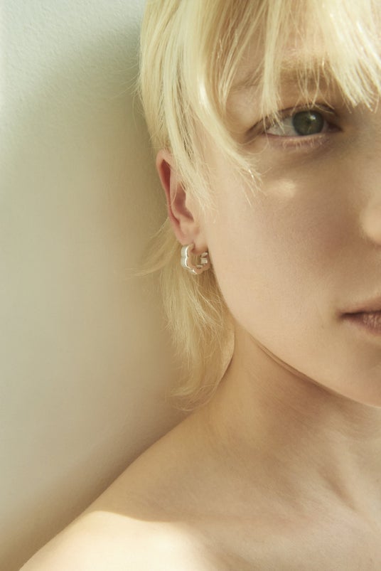 ピアスは波打つようなフォルムが耳元にやわらかな陰影を生み、