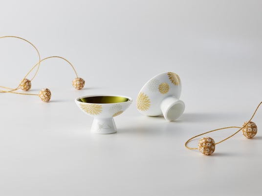 紅の玉虫色の輝きは、上質な証。水に触れた瞬間、幻想的な輝きから鮮やかな紅色へと変わります。この度、紅猪口(べにちょこ)のデザインに、美しい色を秘めた紅花が咲き誇る様子を採用。艶消しのゴールドとシルバーで清楚に表現しました。高台には、これから花開く一輪の紅花を描いています。