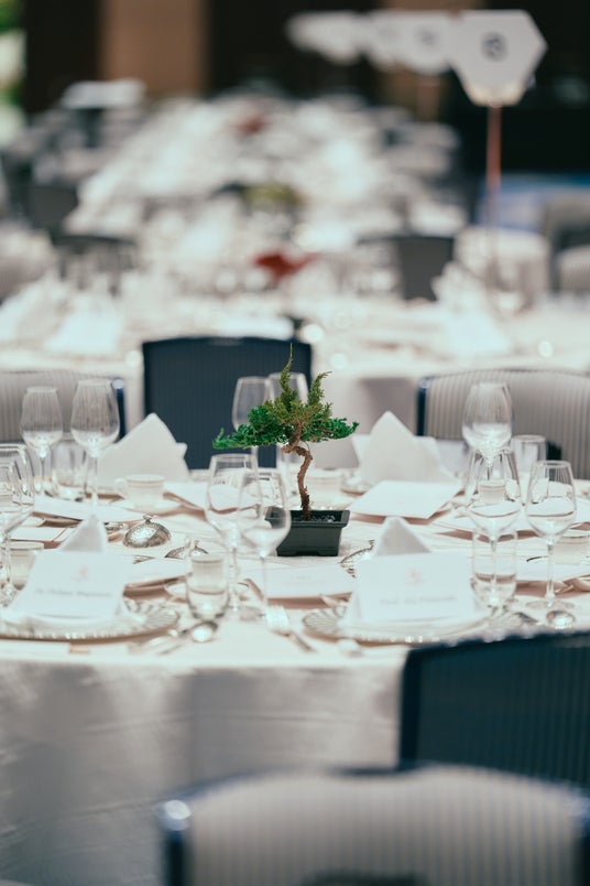 ステージと各テーブル中央には、時間の経過とともに美しさを宿す“枯盆栽”をアートとして展示。自然と生命の循環を象徴するその造形は、「美の持続」と「再生」という本パーティーのテーマを体現しました。映像・照明・音楽が一体となった演出により、自由が丘クリニックが掲げる“美と再生医療の融合”という新たな医療のかたちを印象づけました。