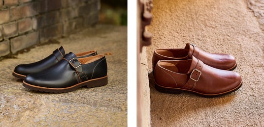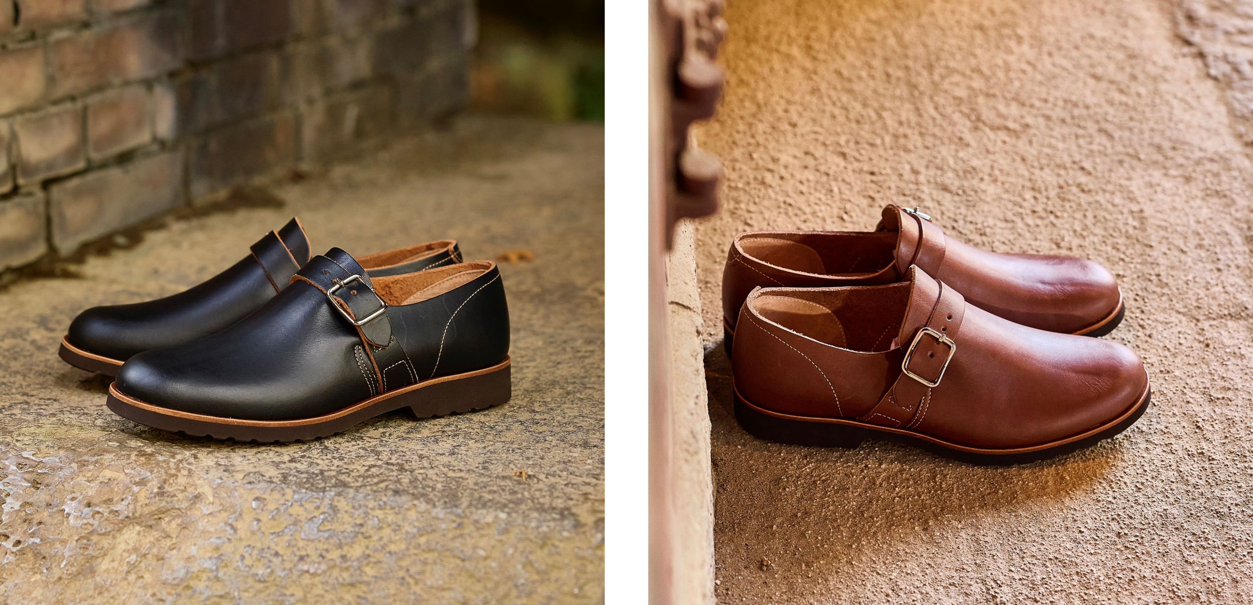 甲の上のストラップでフィットさせる、モンクストラップと呼ばれるデザインを KOTOKA らしくアレンジした靴です。通常、ドレス靴によく使われるこのデザインを、裏張り(ライニング)を付けない厚手の一枚革でつくりました。スマートさと無骨さがブレンドされているのが、この靴独特の個性になっています。厚さ3mmの極厚手の革ですが、少し履くと柔らかく足に馴染みます。ブラックとブラウンの2色展開。ブラックは履き込むと革の下地の茶色が見えてくる、茶芯の革。ブラウンは経年やお手入れにより色合いが深まる革。どちらも経年変化が楽しめます。