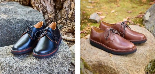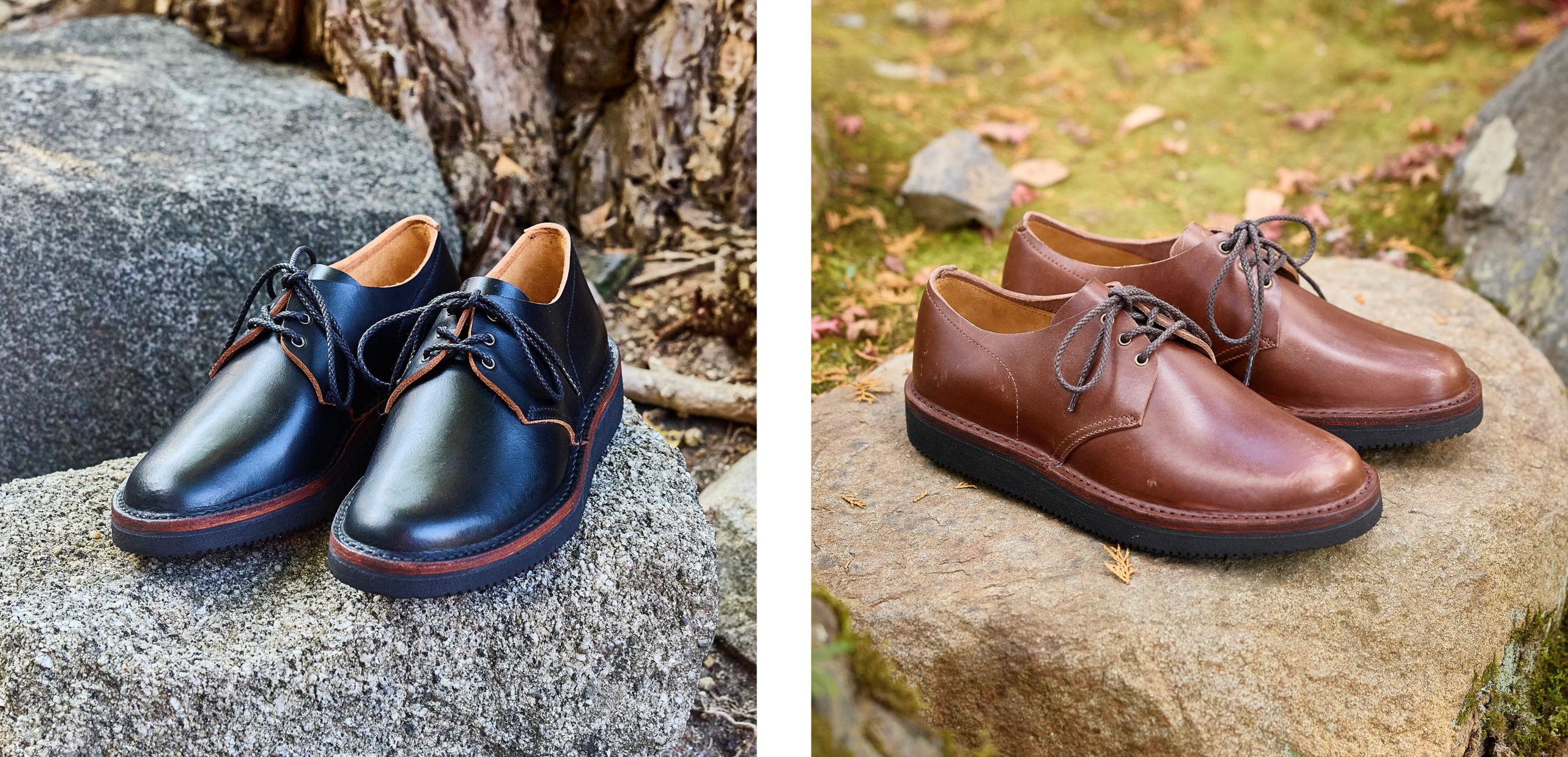 KOTOKAの2種類の木型のうち、ややタイトなフィット感のラウンドラストを使って、ステッチダウン製法でつくった外羽根ダービータイプの靴です。どちらも厚さ約3mmという極厚手ながら足馴染みの良い革を、ライニング(裏張り)を付けない一枚革で靴にしています。ブラックとブラウンの2色展開。ブラックは履き込むと革の下地の茶色が見えてくる、茶芯の革。ブラウンは経年やお手入れにより色合いが深まる革。どちらも経年変化が楽しめます。