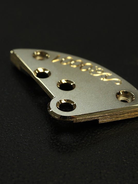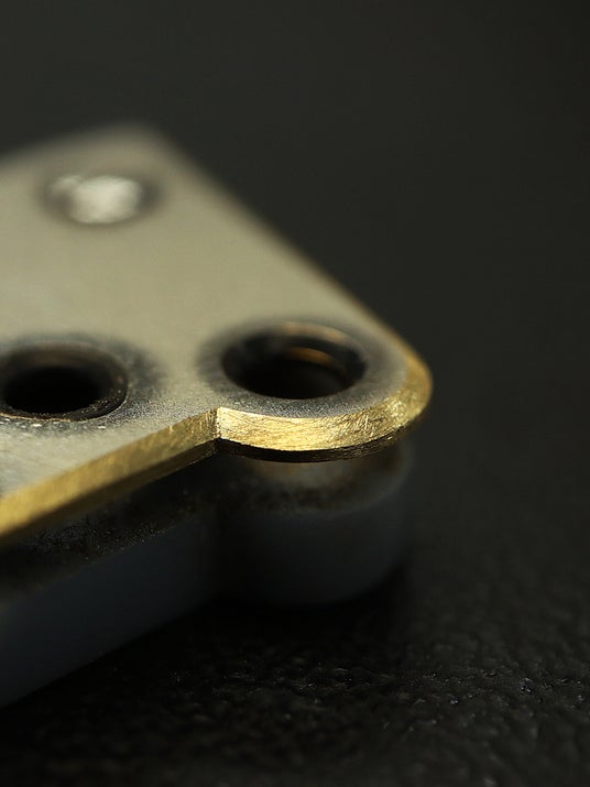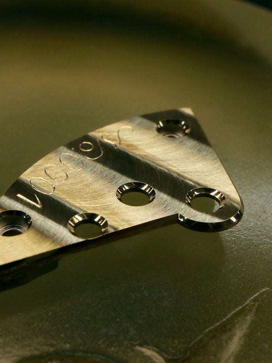 ブリッジの加工にはCNCを用いず、全て時計師 飯塚の手作業(ヤスリがけ)によって独自のシェイプや戻り角、幅広(0.6mm)な面取りを形成。その後、表面がいったん鏡面になるまで磨かれ、企業秘密となる独自の工程を経て、木製の回転工具による半円型のコート・ド・ジュネーブが施されます。この半円型コート・ド・ジュネーブは、通常の1/4円型コート・ド・ジュネーブに比べ非常に弱い力で彫り込むため、ブリッジ表面に凹凸感が生じにくいのが特徴です。また、仕上げの済んだブリッジや地板は、通常のロジウムメッキではなく24Kゴールド(純金)メッキが施されているため、極めて鮮やかなゴールドカラーを発色しています。