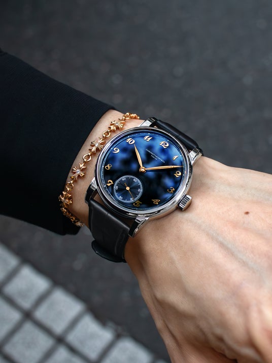 ポリッシュラッカーやヘアラインを駆使した文字盤の製造は、国内大手メーカーの高級モデルを数多く手掛ける株式会社昭工舎によるもの。1940年代のように抑揚を効かせた複雑な造形で設計されたブレゲ数字は、懐中時計世代と同等の厚さ(約0.15mm)でアプライドパーツ化され、0.4mm厚の文字盤に植えつけられています。