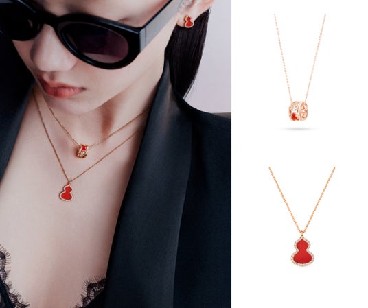 ダイヤモンドとレッド HyCeram(R) (スイスのプレシディウム社が開発したハイブリッドセラミック素材)をあしらった18Kローズゴールドの“Wulu Eternity ”ネックレスにコーディネートするのは、レッドアゲートとダイヤモンドを組み合わせた“Wulu Small”ネックレス。また“Wulu Medium ”のイヤースタッドが、温かみのあるカラーの力強いスタイルで、モダンなエレガンススタイルを完成させます。