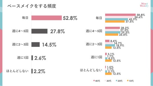 さらに年代ごとに見ると、「毎日」ベースメイクをすると回答した人が最も多かったのは「40代(58.8%)」でした。このことから、美容好きのなかでも特に40代は、毎日の習慣としてベースメイクをしていることが分かります。