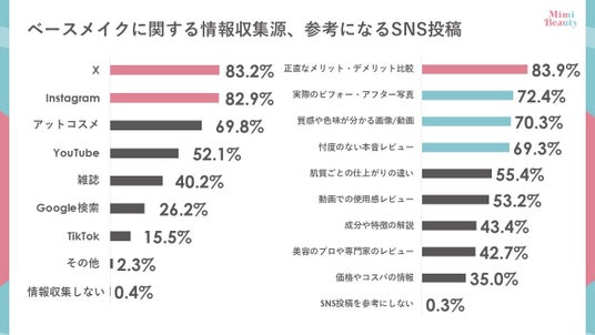 最後に、ベースメイクに関する情報収集源について調査したところ、「X」が最も多く83.2%、僅差で「Instagram」が82.9%となりました。