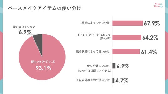次にベースメイクアイテムの使い分けについて聞いたところ、「使い分けている」と回答した人は93.1%でした。また、60%以上が「季節」や「イベントやシーン」、「肌の状態」によってベースメイクアイテムを使い分けていることが分かりました。
