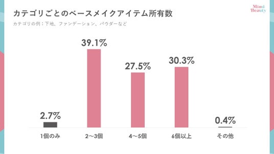 さらに、下地、ファンデーション、パウダーなどベースメイクのカテゴリごとのアイテム所有数については、「2~3個以上」持っている人が約97%でした。このことからも、美容好きのほとんどはカテゴリごとにベースメイク商品を複数個所有し、季節やイベント、肌の状態によって商品を使い分けていることが分かります。