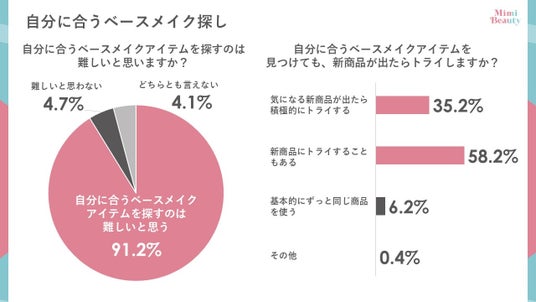- 大多数が「自分に合うベースメイクアイテムを探すのは難しい」と感じ、新しいアイテム探しに意欲的