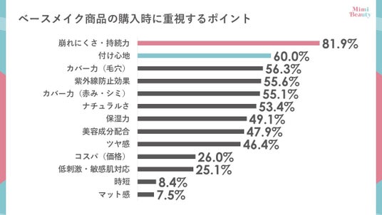 - ベースメイク商品購入時に最も重視するのは「崩れにくさ・持続力」