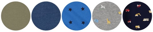 左から順に、ワッフル、デニムニット、星柄、動物柄、車柄
