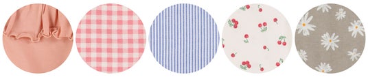 左から順に、バックフリル、チェック柄、ストライプ柄、フルーツ柄、花柄