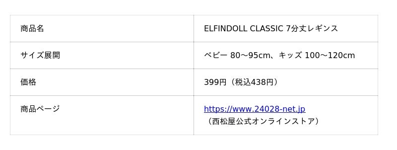 株式会社西松屋チェーン(兵庫県姫路市、代表取締役社長:大村浩一)では、プライベートブランド「ELFINDOLL CLASSIC」の大人気定番アイテムである7分丈レギンスを、今期も新柄・新色を加え展開しております。
