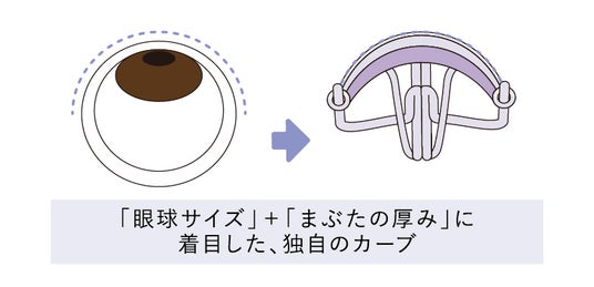 - 千差万別な「まぶたのカーブ」ではなく、「眼球サイズ」+「まぶたの厚み」に着目した、独自のカーブを採用。ひとえ・奥ぶたえのまぶたにぴったりフィットします。
