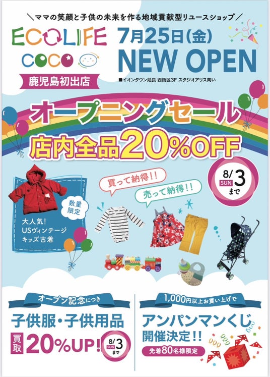 子供服リユースショップECOLIFE COCO(エコライフココ)「イオンタウン姶良店」を2025年7月25日(金)にオープンいたします。オープニングを記念して、店内全商品20%OFF、買取査定額20%UPの特別キャンペーンを実施いたします。さらに、かわいいアンパンマンくじや、数量限定のUSヴィンテージキッズ古着の販売も予定しています。お子さまもママも楽しめる、おトクがいっぱいのイベントです。ぜひご来店ください!