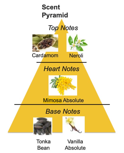ふんわりとした繊細な甘さを持つミモザに、カルダモンがフレッシュさと上品さを添える。さらに、トンカビーンとバニラアブソリュートが加わることで、優しい甘さが全体のバランスを整え、香りは完成へと導かれます。