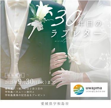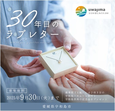 全国有数の真珠生産地である愛媛県宇和島市は、結婚30年目(真珠婚)を迎えるご夫婦・結婚1年目のご夫婦からパートナーに宛てたラブレターを募集します。印象に残った作品を応募いただいたご夫婦には、記念品として2泊3日の宇和島ハネムーン旅行券と宇和島真珠製品が贈呈されます。