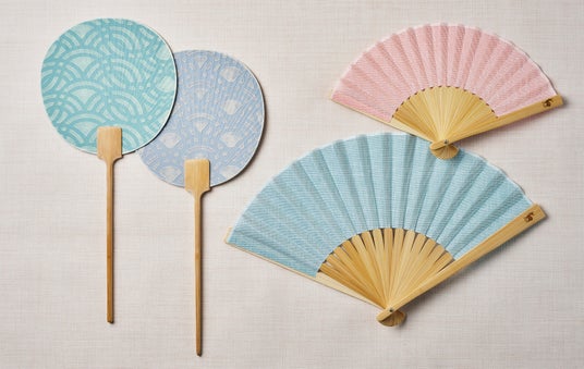 【1F 中川政七商店】(左)福井県の作り手が独自技術で仕上げた和紙で仕立てた団扇 浮き紙団扇 各2,970円/(右)扇面がすれて汚れないよう親骨を太く仕上げました。 袋がいらないかや織扇子 各3,520円