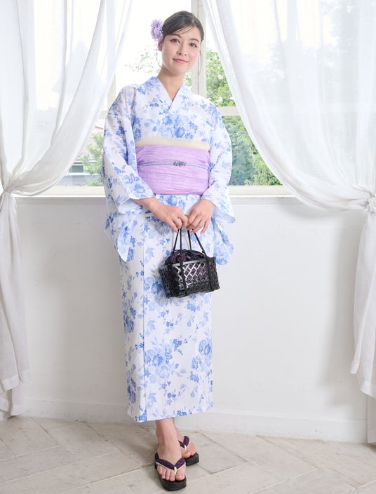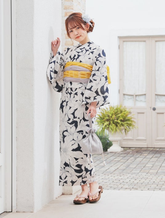 【3F ハニーズ】帯と浴衣は組み合わせ自由!自分だけの浴衣スタイルを思いのままに。 浴衣 4,980円/兵児帯 各1,980円/浴衣髪飾り(リボンセット)1,480円/巾着(ワンハンドル) 1,980円/下駄 2,280円