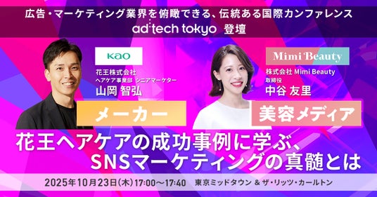 株式会社Mimi Beauty(所在地:東京都渋谷区、代表取締役社長:黒川 涼子)が運営する美容メディア「Mimi Beauty」は、広告・マーケティング業界を俯瞰できる、伝統ある国際カンファレンス「ad:tech tokyo(10月22日~24日、於:東京ミッドタウン&ザ・リッツ・カールトン)」において、2025年10月23日(木)に行われるエグジビションステージに登壇します。ステージではMimi Beauty中谷 友里が、ゲストスピーカーに花王株式会社(本社:東京都中央区、代表取締役 社長執行役員:長谷部 佳宏)山岡 智弘氏をお招きし、トークセッションを実施します。