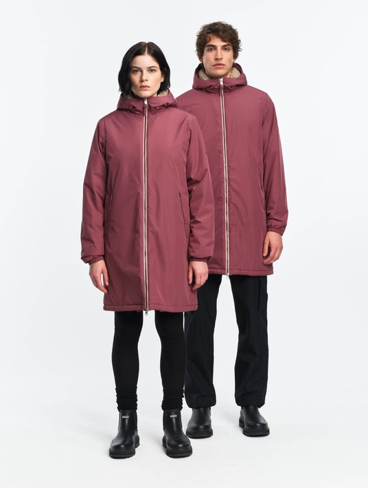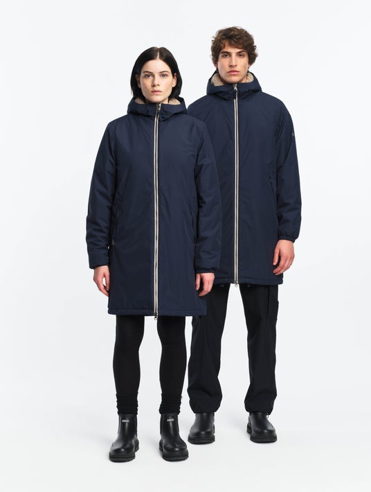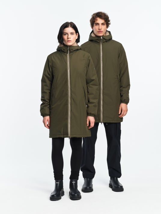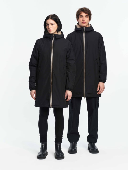 愛犬用モデルには取り外し可能なフードが付いており、雨や雪から毛並みを守り快適に過ごせるデザインです。飼い主とお揃いのスタイルで、冬の街やアウトドアを一緒に楽しめます。