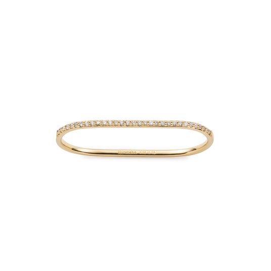 繊細さと大胆さが共存する、2本の指にかけるダイヤモンドハーフエタニティダブルフィンガーリング。ゴールドバーに整然と並ぶダイヤモンドが指先にシャープな輝きのラインを描き、モードな空気をまとう。Hirotakaが提案する、新たな定番。