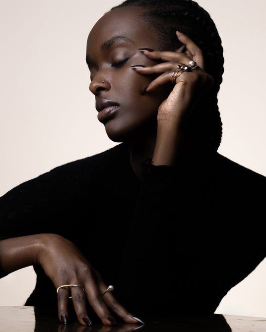 直線や円、幾何学モチーフを組み合わせ詩の世界を描こうとしたミロの作品からインスパイア。ダブルフィンガーリングの中央に配されたダイヤモンドは、まるで私的なアイコンのよう。さりげないモード感が光るスタイリングに。