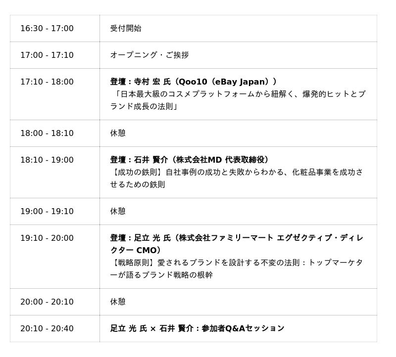 本イベントでは、日本最大級のECモール「Qoo10」を運営するeBay Japan合同会社、課題解決型OEMのベイコスメティックス、そしてスペシャルゲストとして株式会社ファミリーマート エグゼクティブ・ディレクター CMOの足立光氏が登壇。「データ・実行・戦略」の3つの視点から、偶発的なヒットではなく「狙って勝つための必然」を解き明かします。