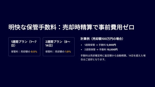 ※例:100万円の売却額に対し、1週間の保管なら5,000円、2週間の保管なら10,000円の保管料