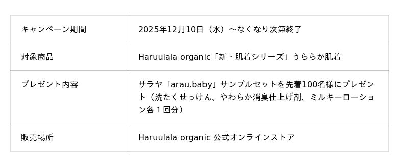 このリニューアルを記念して、自然派製品で多くの家庭に親しまれている サラヤ株式会社との「子育て応援・プレゼントキャンペーン」を実施いたします。対象の肌着を購入された方、先着100名様に「arau.baby」のサンプルをプレゼントいたします。