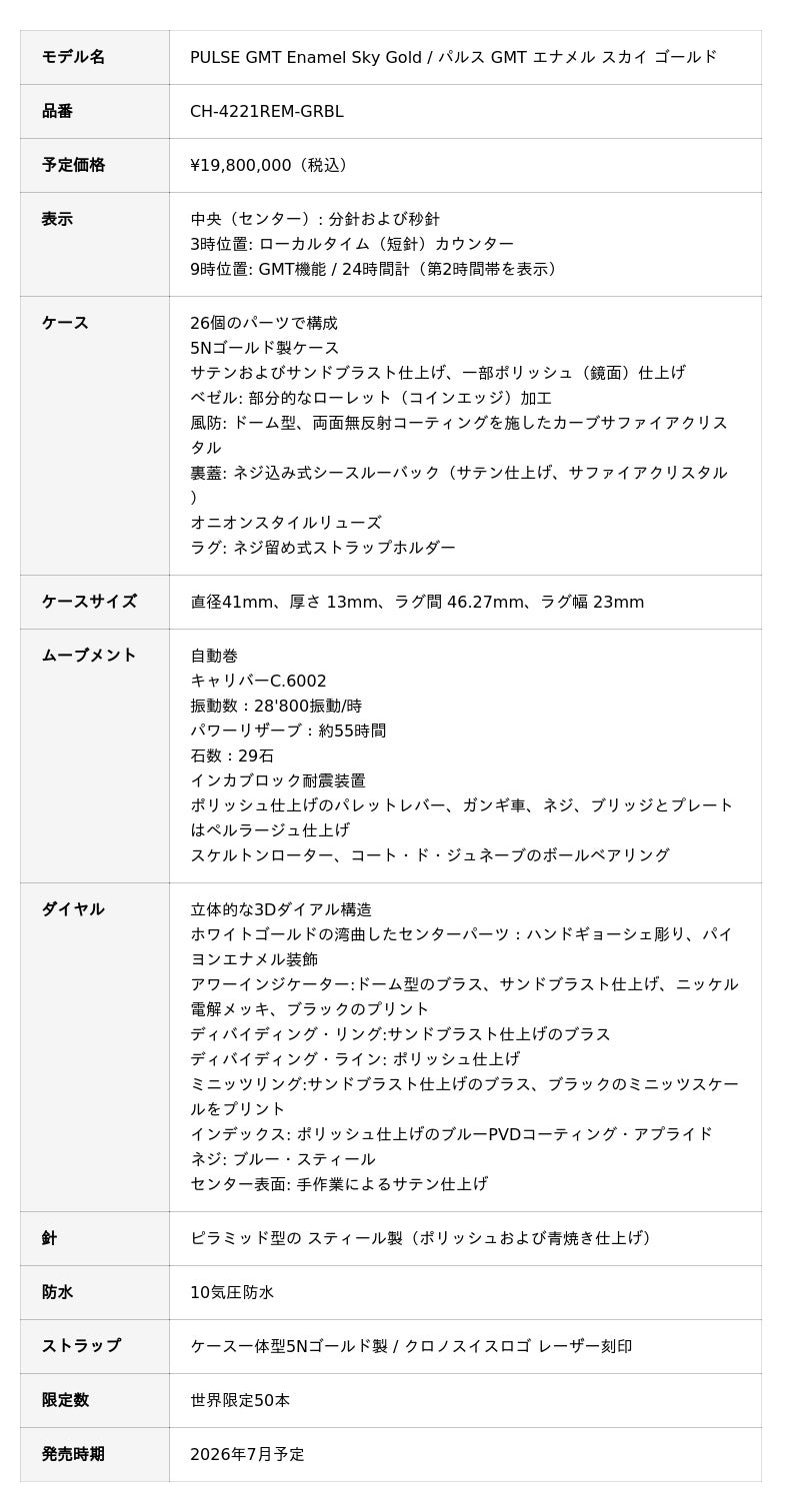 クロノスイスから、ブランドコンセプトである「モダン・メカニカル」を象徴する最新作『PULSE GMT Enamel Sky Gold(パルス GMT エナメル スカイ ゴールド)』が登場しました。