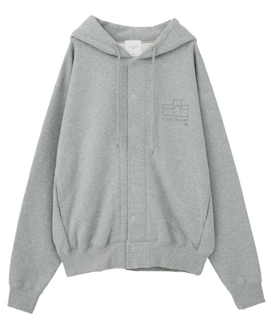 リングスナップが特徴のオーバーサイズフーディ。藤原ヒロシ氏がデザインしたグラフィックが前後にプリントされています。グラフィックイメージは、Clane (クレーン)という町に修道院などの遺跡があることからイメージされたモチーフ。前面には教会をイメージしてデザインされた線画モチーフと、背面には教会を上から見たイメージで作り上げたグラフィックがプリントされています。素材には、肌触りが柔らかく保温性の高い裏起毛スウェット生地を使用しました。3サイズ展開で、Lはメンズの方でも着用していただけるサイズ感となっています。