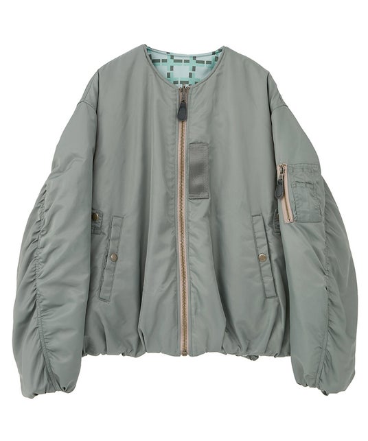 MA-1をベースとしたリバーシブルデザインのアイテム。藤原ヒロシ氏がデザインしたグラフィック生地が内側に使われています。柄のイメージは、Clane (クレーン)という町に修道院などの遺跡があることから、教会を上から見たイメージで作り上げたグラフィック。ノーカラーで中綿の量を調整し、全体的に丸みのあるデザインに仕上げています。今回はリブを使わず、よりモダンなデザインに仕上げました。無地とグラフィックで全く違う印象で着用していただけます。