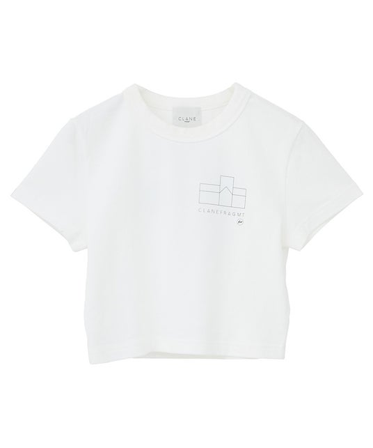 ストリート感のあるコンパクトなサイズ感のクロップドTシャツ。藤原ヒロシ氏がデザインしたグラフィックが前後にプリントされています。グラフィックイメージは、Clane (クレーン)という町に修道院などの遺跡があることからイメージされたモチーフ。前面には教会をイメージしてデザインされた線画モチーフと、背面には教会を上から見たイメージで作り上げたグラフィックがプリントされています。