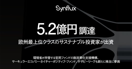 Synflux株式会社(シンフラックス 、以下Synflux|代表:川崎和也)は、Goldwin Play Earth Fundをリード投資家として、本ラウンドの2ndクロージングにあたり、Collateral Good、株式会社脱炭素化支援機構、サーキュラーエコノミー・ネイチャーポジティブ1号投資事業有限責任組合、株式会社サザビーリーグから、5度目の資金調達として合計2.7億円を調達いたしました。本ラウンドの合計調達額は5.2億円、当社の累計調達総額は7.4億円となります。