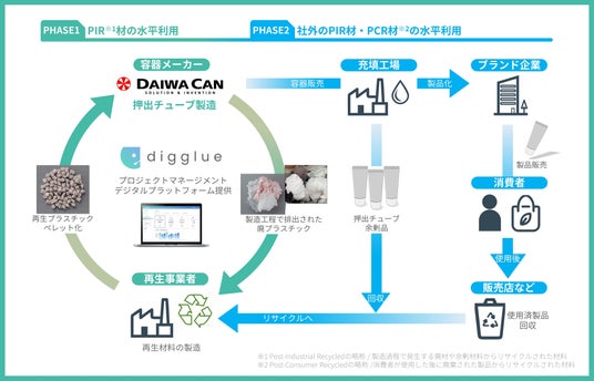 今回の実証実験結果を踏まえ、工場内の廃プラスチック材を活用した押出チューブの水平リサイクルの実現(製品化)を推進していきます。また長期的な目標として内容物の充填工場で発生するロス品や、消費者が使用した使用済容器についても、再生プラスチック材の原料としての水平リサイクルも検討していきます。(PHASE2)本取り組みはdigglue社が提供している循環型デジタルプラットフォーム「MateRe(マテリ)」を活用し、温室効果ガス(GHG)排出量やトレーサビリティデータの可視化を行うことでステークホルダーへの提案を進めていきます。この2社による取り組みは循環経済への更なる理解醸成と取組促進を目指すための官民連携強化を目的とした官民パートナーシップである「循環経済パートナーシップ(J4CE)」にも取組み事例を掲載しています。