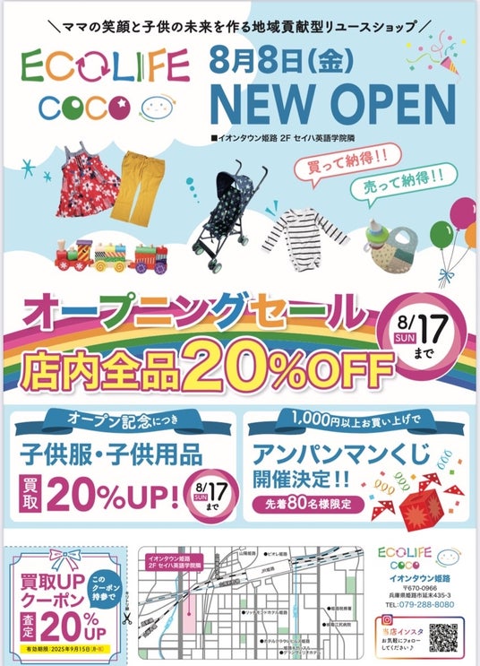株式会社AVANCE(本社:東京都豊島区、代表取締役:葛西 佳織)が運営する子供服リユースショップ「ECOLIFE COCO(エコライフココ)」は、2025年8月8日(金)、富山県と兵庫県にそれぞれ初出店となる新店舗を2店舗同時にオープンいたします。