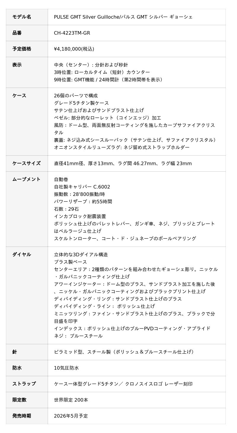 クロノスイスから、ブランドコンセプトである「モダン・メカニカル」を象徴する最新作「パルス GMT シルバー ギョーシェ」が登場しました。