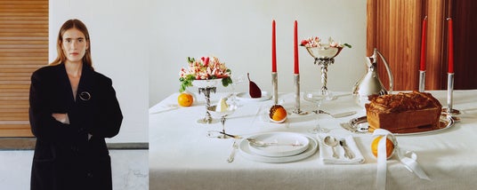 一方で、テーブルセッティングには、さらに計画性が必要です。「ゲストが心地よく過ごせるように、事前に食事の流れを頭の中でリハーサルします」とラズロは話します。彼女のホリデーテーブルは、白いポーセリンとスターリングシルバー製の銀器を組み合わせています。そこに並ぶのは、アール・ヌーヴォーの繊細な装飾が美しい1918年の《グレープ ボウル 283》、槌目仕上げとビーズの縁取りが印象的な1936年のカトラリー、溝の入った縁が凛とした印象を与える《ベルナドッテ》シリーズのプレート、そしてシグヴァルド・ベルナドッテが1938年にデザインした、直線的な柄が特徴のシルバーキャンドルホルダー。