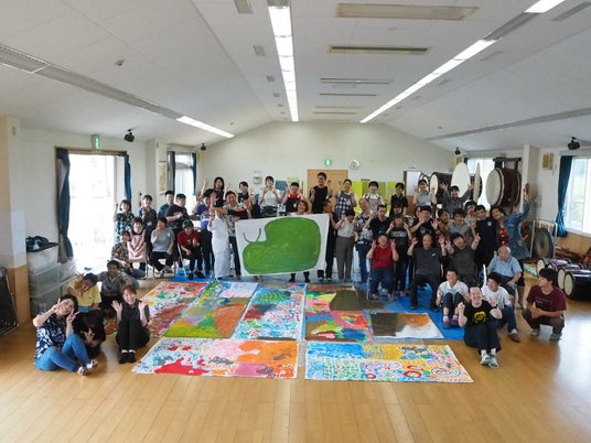 徳武産業・徳武社長(中央)と、アートを描き上げた征峯会の利用者様、スタッフ一同。大きな紙を囲んで共に色を重ねたあの日、私たちは「支援する側・される側」という垣根を超え、一つのチームになりました。