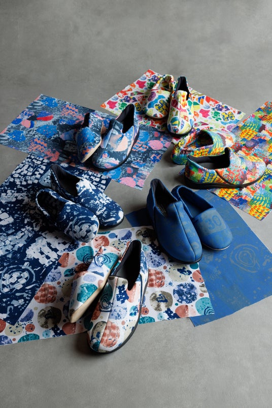 今回のアートモデルのベースに選ばれたのは、手を使わずに履ける『瞬感スポッと』と、お部屋での定番『エスパド』です。どちらも、あゆみシューズの中で多くのお客様に信頼されてきたモデルです。